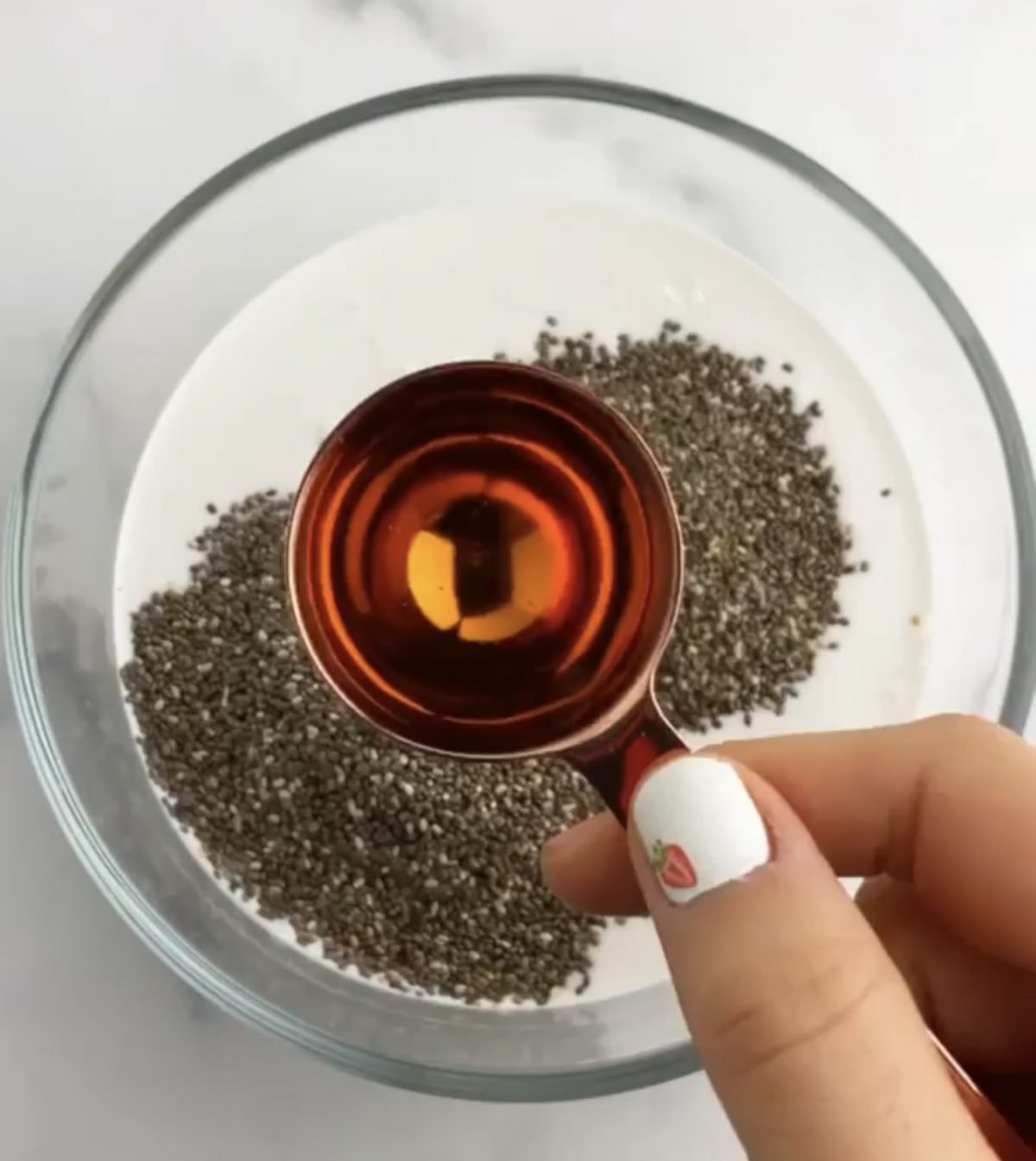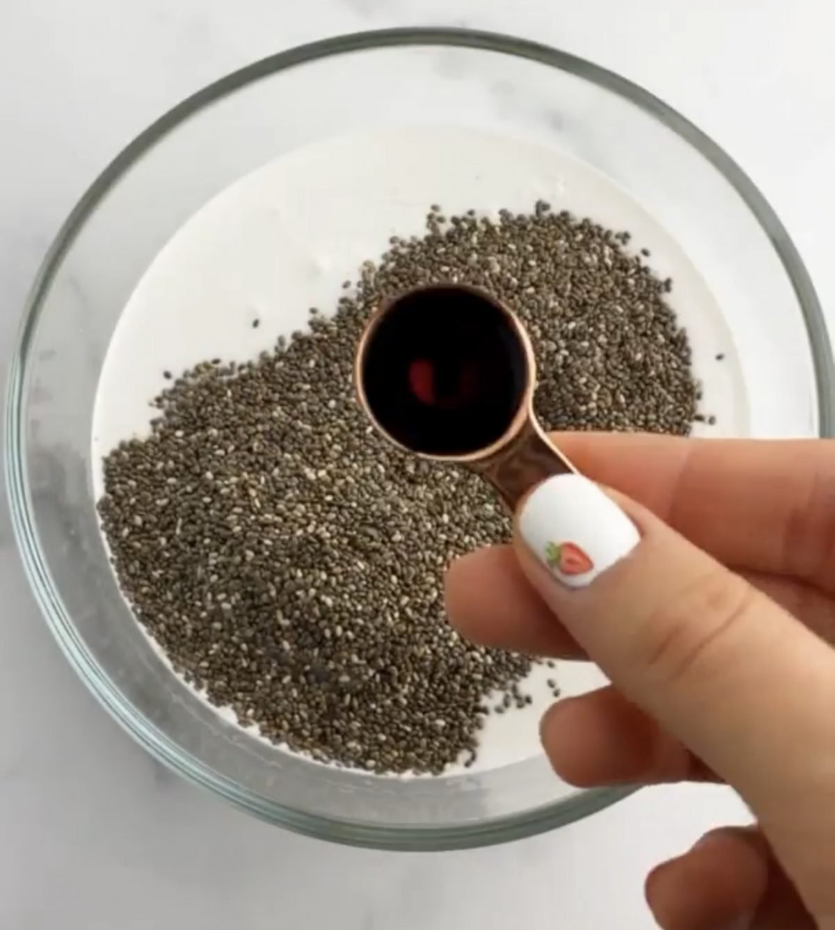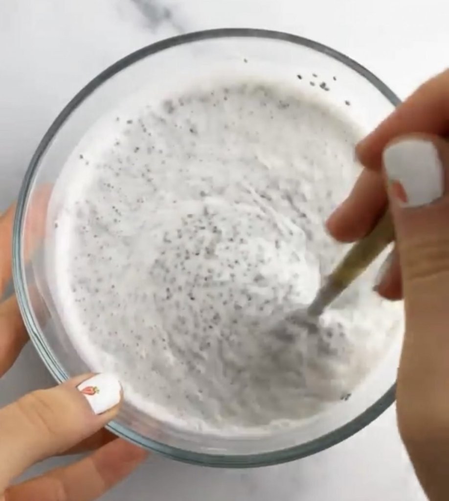 - В купа добавете кокосовото мляко, семената от чиа, кленовия сироп и ванилията.