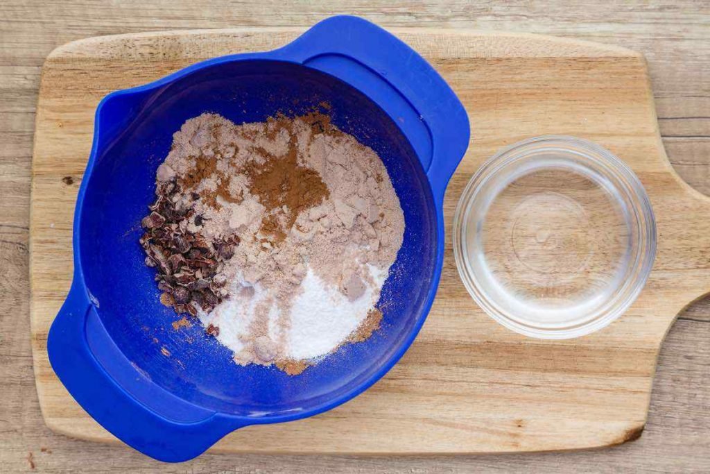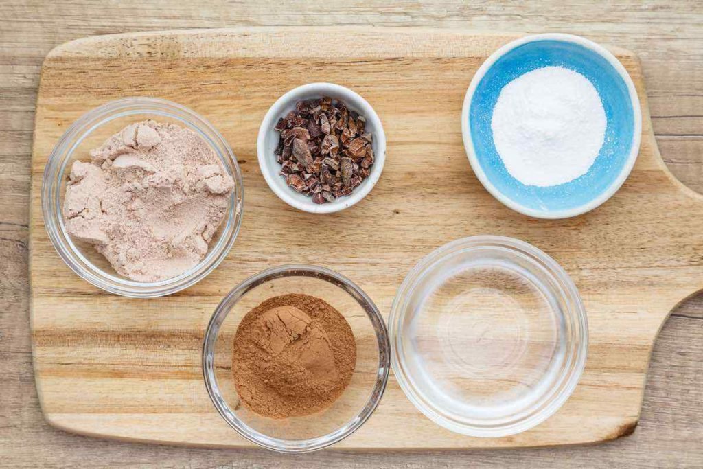 В купа поставете протеина на прах, какаото на прах, подсладителя и какаовите зърна и разбъркайте, за да се комбинират.