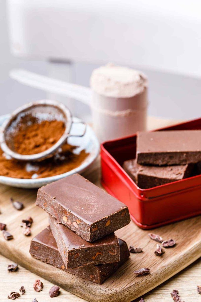 Тези домашно приготвени шоколадови кето протеинови блокчета имат дяволски страхотен вкус и отнемат само няколко минути, за да ги приготвите, като използвате смес от шоколадов протеин на прах, сурово какао на прах и какаови зърна за малко хрупкавост. Освен това има добавена малко стевия, за да ги подслади съвсем леко, докато малко разтопено кокосово масло добавя малко MCT наситени мазнини в сместа, за да направи тези протеинови блокчета жизнеспособна опция и за кето диети.