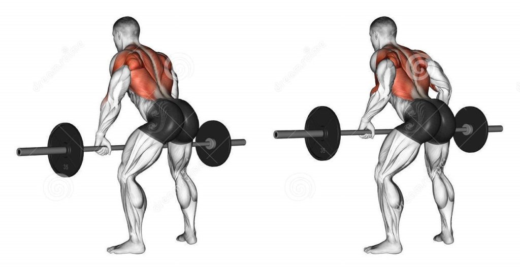Също основно упражнение за покачване на мускулна маса в областта на гърба. Упражнението се състои в повдигане на щанга към корема.