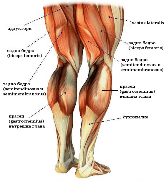 1. Двуглав мускул на бедрото (Biceps femoris) – е мускул във вътрешната част на бедрото, който започва в областта на бедрото и завършва в коляното. Позволява флексия и завъртане на колянната става и екстензия в тазобедрената става.