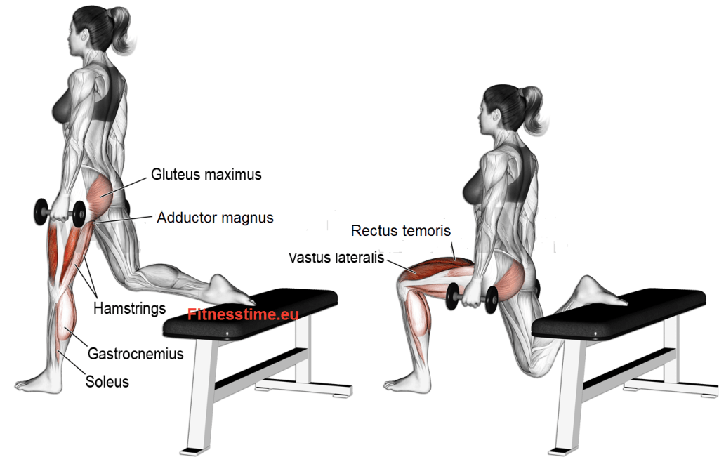 • Вземи по един дъмбел във всяка ръка. Постави единия крак върху опора – напречно разположена тренировъчна пейка, стол и др.