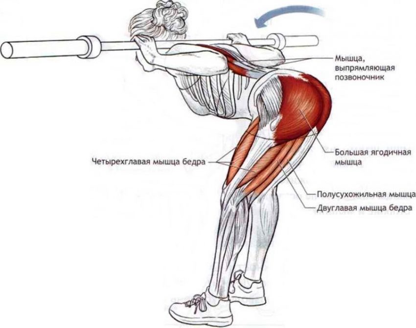 Основното предимство на това упражнение е, че за да го изпълнявате, не се нуждаете от уреди, а само от щанга. Започнете изправени с щанга на раменете, през това време дръжте гърба си стегнат. Сгънете леко колене, избутайте дупето си назад и се наведете напред до ъгъл от 90 градуса. След това при вдишване се върнете обратно в изходна позиция. Освен задните бедрени мускули с това упражнение укрепвате също и седалищните мускулии мускулите в долната част на гърба.