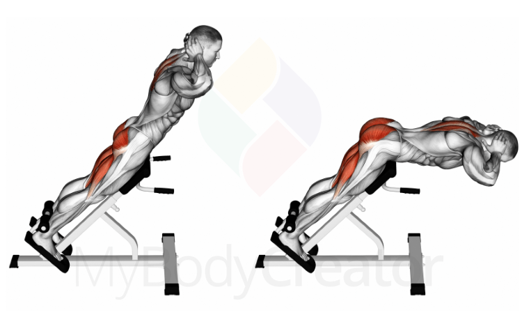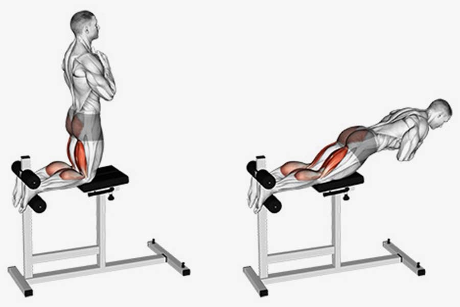 Това упражнение много ще ви напомня за хиперекстензиите. Можете да го изпълнявате на специална GHR лежанкаили вашият спаринг партньор може да ви помага. Ако във фитнес залата има подходяща лежанка, поставете краката си стабилно между цилиндрите, сложете бедрата си върху платформата и започнете. По време на цялото упражнение дръжте стегната долната част на гърба ииздишвайки изпълнявайте движението надолу. След това се повдигнете в изходно положение, така че коленете ви да са под ъгъл от 90 градуса.